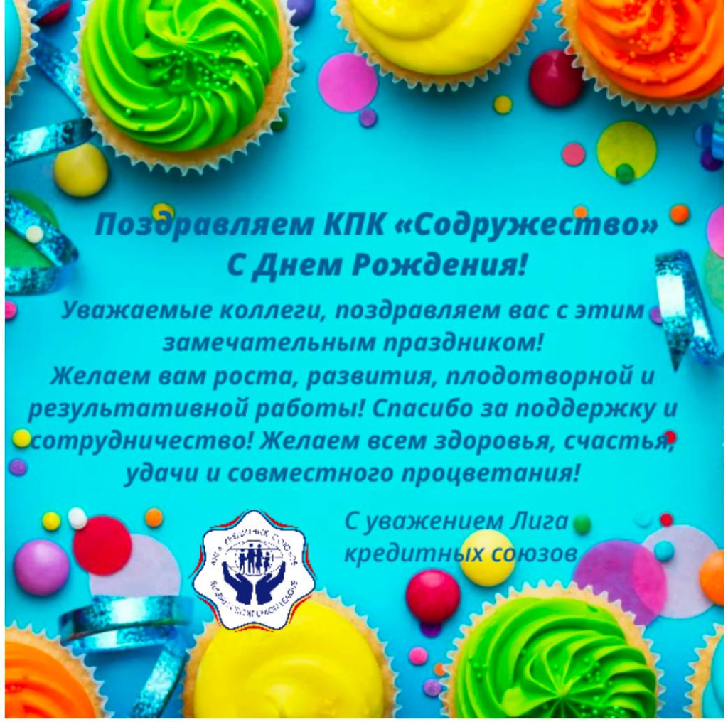 Поздравляем Вас с днем рождения КПК "Содружество". Проделана немалая работа, чтобы достичь всего того, что сейчас есть. Мы искренне хотим пожелать развития, стабильности, финансового благополучия, чтобы все поставленные цели и задачи были реализованы. Желаем много-много лет уверенной деятельности, целеустремленности к успеху, высокой репутации и безупречного качества. Пусть всегда имеется возможность для реализации грандиозных планов, пусть для нашего КПК "Содружество" не будет ничего сложного и невозможного. Креативных идей, ответственных сотрудников и хороших перспектив.